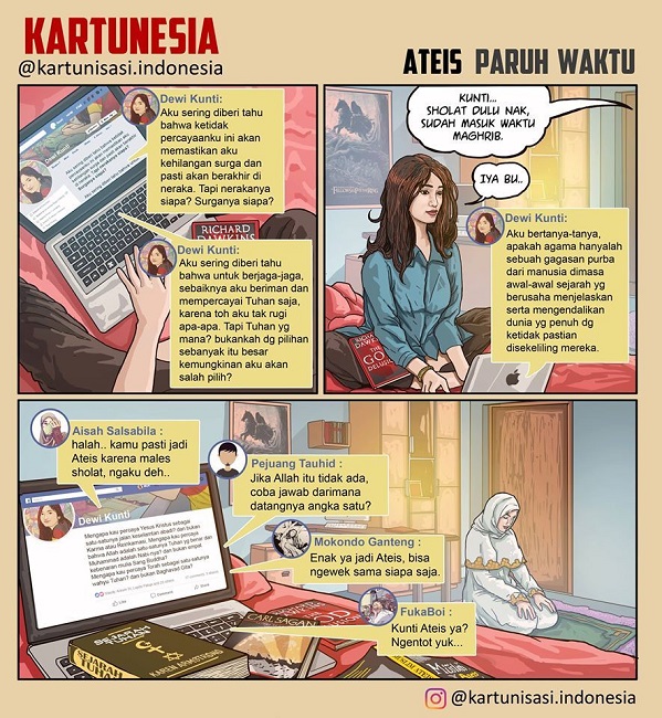 Many Indonesian atheists left religion because of bad personal experiences. Others left because they believe in science, which they see as being in conflict with religion. The decision to become an atheist is a personal one in the first place, but it heavily influences the way someone engages in a religious society. Having taken that step, one has to find out what it means for everyday relationships. Atheism, in return, can be an expression of uneasiness with the religious foundations of society. It allows people to look differently at things mainstream society takes for granted. What appears normal to most Indonesians begins to look like an absurd and arbitrary convention.