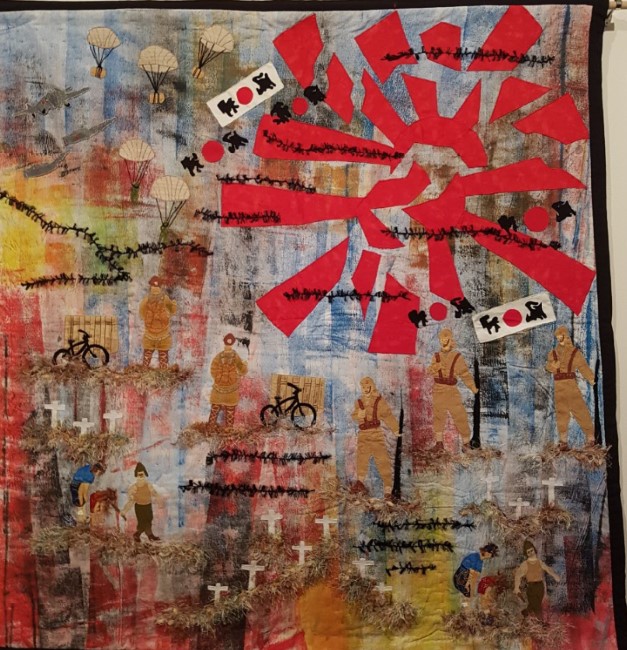 An exhibition of wall-hangings and mixed-media depicts the experiences of European Dutch and Eurasian people in Indonesia during the Japanese Occupation, the Revolution and after