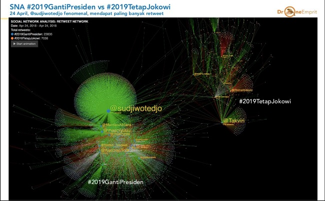 One of the politicians behind the #2019GantiPresiden (‘change the president in 2019’) campaign was Bhisma (not his real name). In our interview with him, he claimed that this hashtag campaign was a ‘constitutional movement’ (gerakan yang konstitusional), because ‘to change the president every five years is a political aspiration that is enshrined in the Constitution’. According to Bhisma, ‘there is nothing wrong with that hashtag to change the president – what’s wrong is that those who support the sitting president then get annoyed with that hashtag’. Bhisma claimed there was no premeditated plan to make the hashtag go viral on social media. He explained that in a polarised political situation, opponents of the president naturally rallied behind this hashtag. All the more ‘because it’s clear that the mainstream media all support Jokowi, while those on social media generally want to change the president’. The hashtag became a ‘uniting force’ for the opposition, he said, which is why ‘the Jokowi regime was so afraid of it’. Because of this fear, offline rallies of the #2019GantiPresiden movement in the regions would often be repressed. ‘If Jokowi wasn’t backed by the armed forces, he would have lost.’