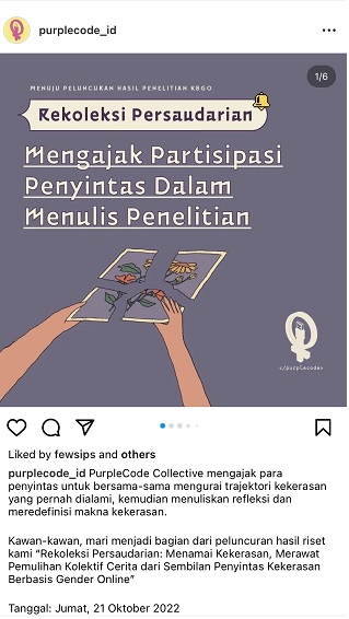 In mid-early 2021, PurpleCode Collective launched a study on Online Gender-based Violence (KBGO). With Instagram as our only social media platform, we worked for nine days, calling survivors to participate. Of the 22 survivors who volunteered, we invited nine of them to work on this research together. The selection was based on the limitation and scope of our research, as well as our ability and energy to walk together, for we did not want to simply gather data and information from them and then leave.
