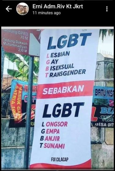 The fourth way was through claiming that LGBT people were the cause of natural disasters. After the 2018 Central Sulawesi earthquake, for instance, which caused a devastating tsunami that hit Palu and Donggala, numerous media sources reported that the catastrophe had been caused by LGBT. To support this ludicrous statement, many Indonesian media outlets invited international guests to comment. This included newsokezone.com interviewing Ghanaian religious leader Mallam Abbas Mahmud; CNN Indonesia interviewing former deputy prime minister of Malaysia Ahmad Zahid Hamidi; and BBC Indonesia interviewing American priest Tony Perkins, all who supported the notion that LGBT communities caused the earthquake and tsunami. When these interviews went viral through Whatsapp, many Indonesians believed what was being said.