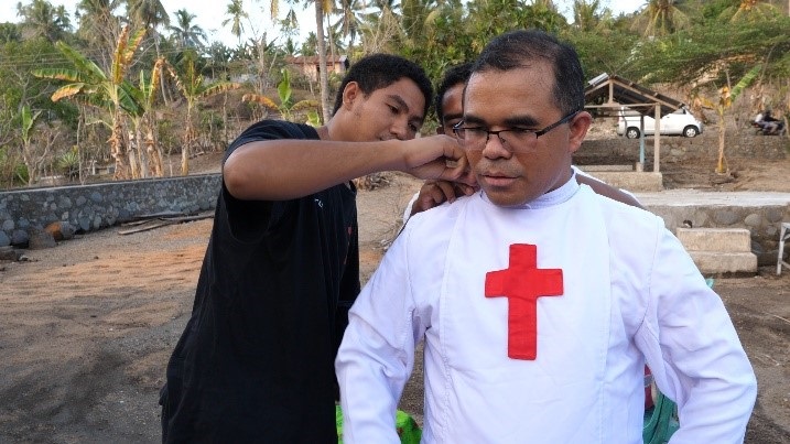 Di suatu sore hari, di awal bulan Desember 2019, kami ikut serta Pater Andi dan Pater Alfons, pastur-pastur dari Ordo Kamilus gereja Katolik, beserta lebih dari selusi mahasiswa mereka, frater-frater Kamilus, berkelana ke Kecamatan Lela, sekitar satu jam perjalanan mobil dari ibukota Kabupaten Sikka, Pulau Flores. Sesaat setelah mobil menepi dan berhenti di lokasi tujuan kami, kedua pater lekas turun dari kendaraan dan bergegas turun ke arah rumah di tepi pantai. Dua orang perawat dari Puskesmas Kecamatan Lela telah menanti. Mereka telah mempersiapkan warga setempat untuk menyaksikan sebuah kegiatan yang cukup teatrikal – sebuah kolaborasi yang tidak lazim antara tenaga kesehatan dan pastur-pastur – yang akan dimulai.