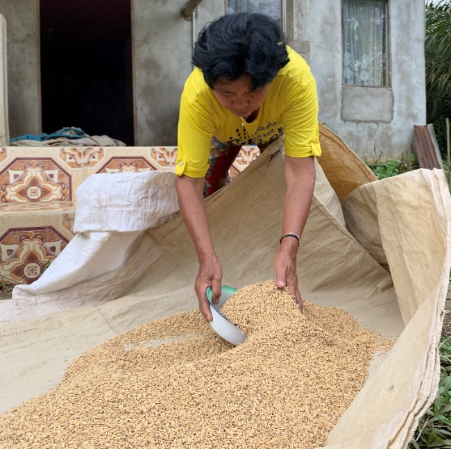 Ibu Lusiana Lelen drying rice (mawant pade). Dayak Benawan people have traditionally engaged in subsistence rice farming to meet their family's needs. But now they can earn more money by working in oil palm plantations. They tend to purchase rice rather than growing it themselves.